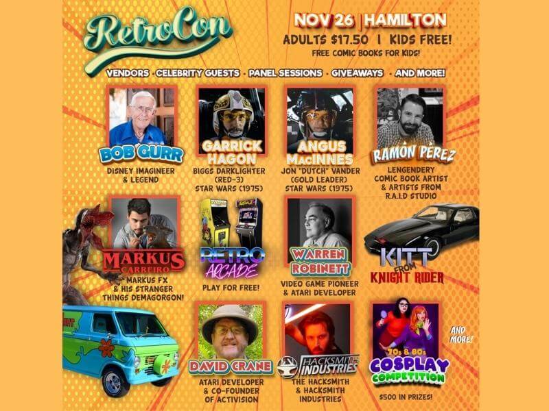 “RetroCon Canada is a family event with special guest celebrities from Star Wars, Disney and Atari. Fun FREE experiences include the Scooby Doo Mystery Machine, a Demogorgan from Stranger Things and Santa. Numerous vendors will be present for all of your Nerd/Geek Holiday Shopping Needs. Donations will be collected in support of the McMaster Children’s Hospital Foundation.”–RetroCon